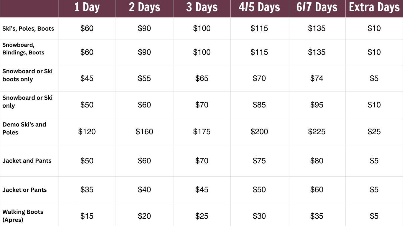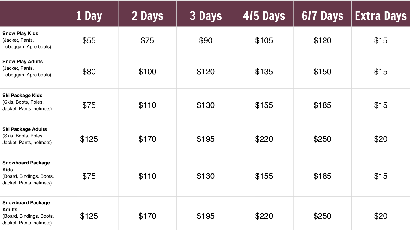 Snow hire rates are charged per days on snow, where you get 2 free travel days: the drive up and the drive back. Example: taking the gear for 5 days would be a 3 day hire charge.